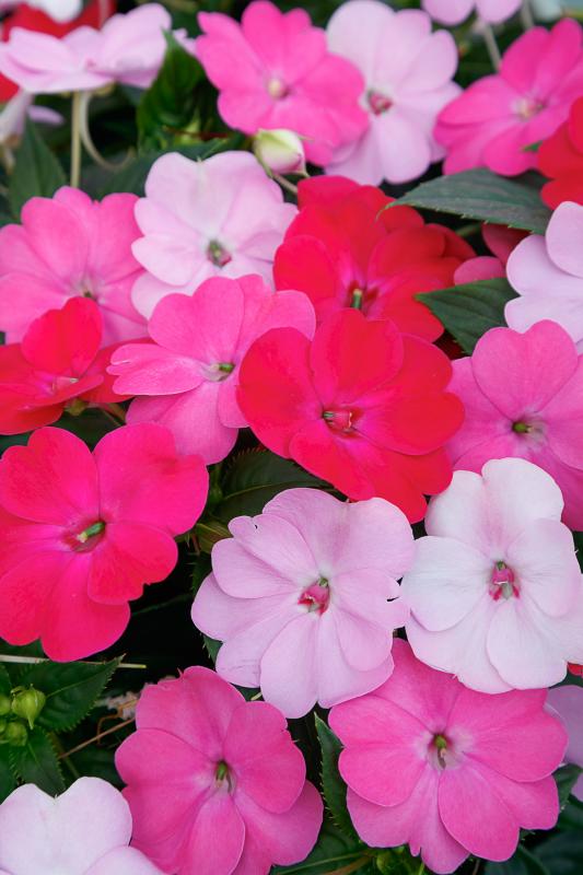 Happy Days Mix contains three colors in one pot: Compact Rose Glow, Compact Orchid Blush and Compact Hot Pink impatiens.