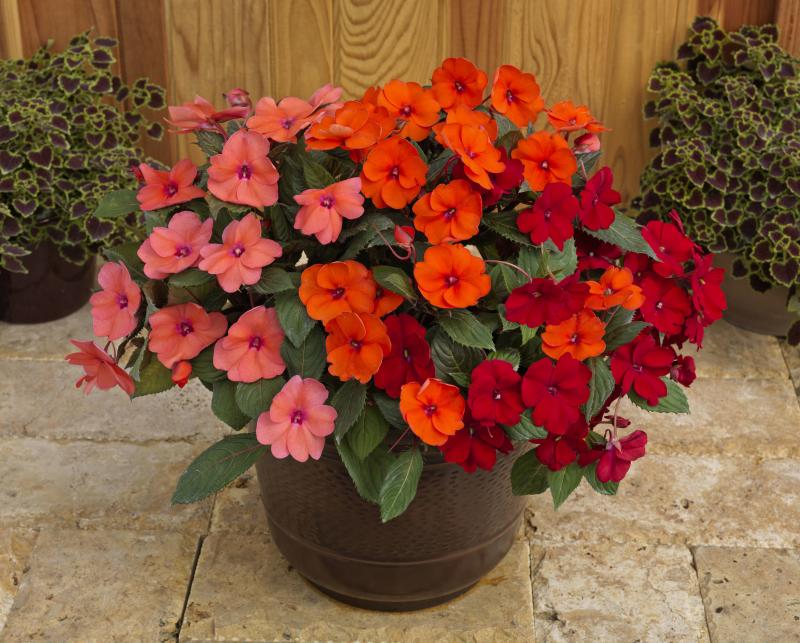 Summer Salsa Mix contains three colors in one pot: Compact Coral Pink, Compact Hot Coral and Compact Red impatiens.