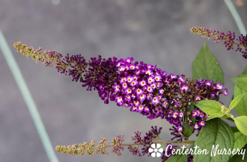 Semi-dwarf Butterfly Bush of slender mint-green foliage topped with flower spikes comprised of multi-toned violet/white/gold flowers. Blooms late spring through summer.