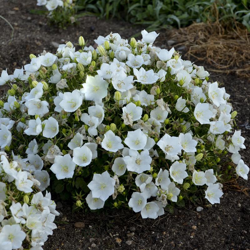 One of the earliest blooming C. carpatica types on the market with good vigor and uniformity.  1-1½" cup shaped, pure white flowers and dark green foliage.