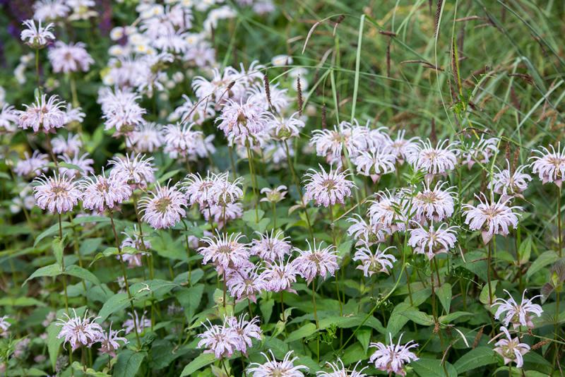 Distinguished by its earlier bloom time, adaptability to drier soils, good disease resistance and speckled flower petals. This is a native Monarda you can easily have in bloom for spring sales. Its non-running foliage forms a short clump of fuzzy, green leaves topped with pale lavender pink to white flowers that attract pollinators.