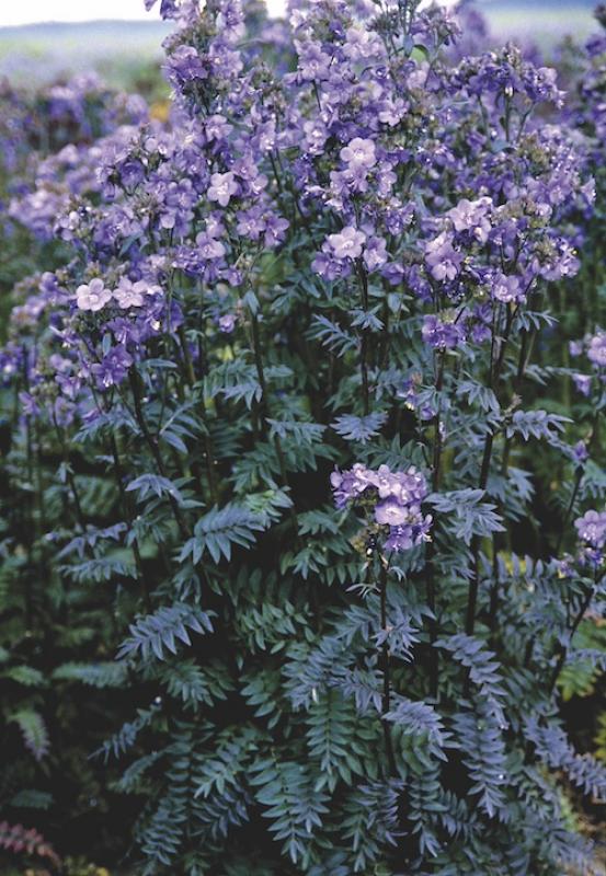 Polemonium 'Purple Rain', also known as Jacob's Ladder, is an exceptional perennial that adds both elegance and drama to your garden with its striking foliage and vibrant blooms. This variety stands out thanks to its deep purple-tinged foliage, which creates a stunning contrast against the soft, airy clusters of light blue flowers that appear in late spring to early summer. The foliage starts out a rich green, gradually deepening into purples as the season progresses, adding multi-season interest and color to your garden.